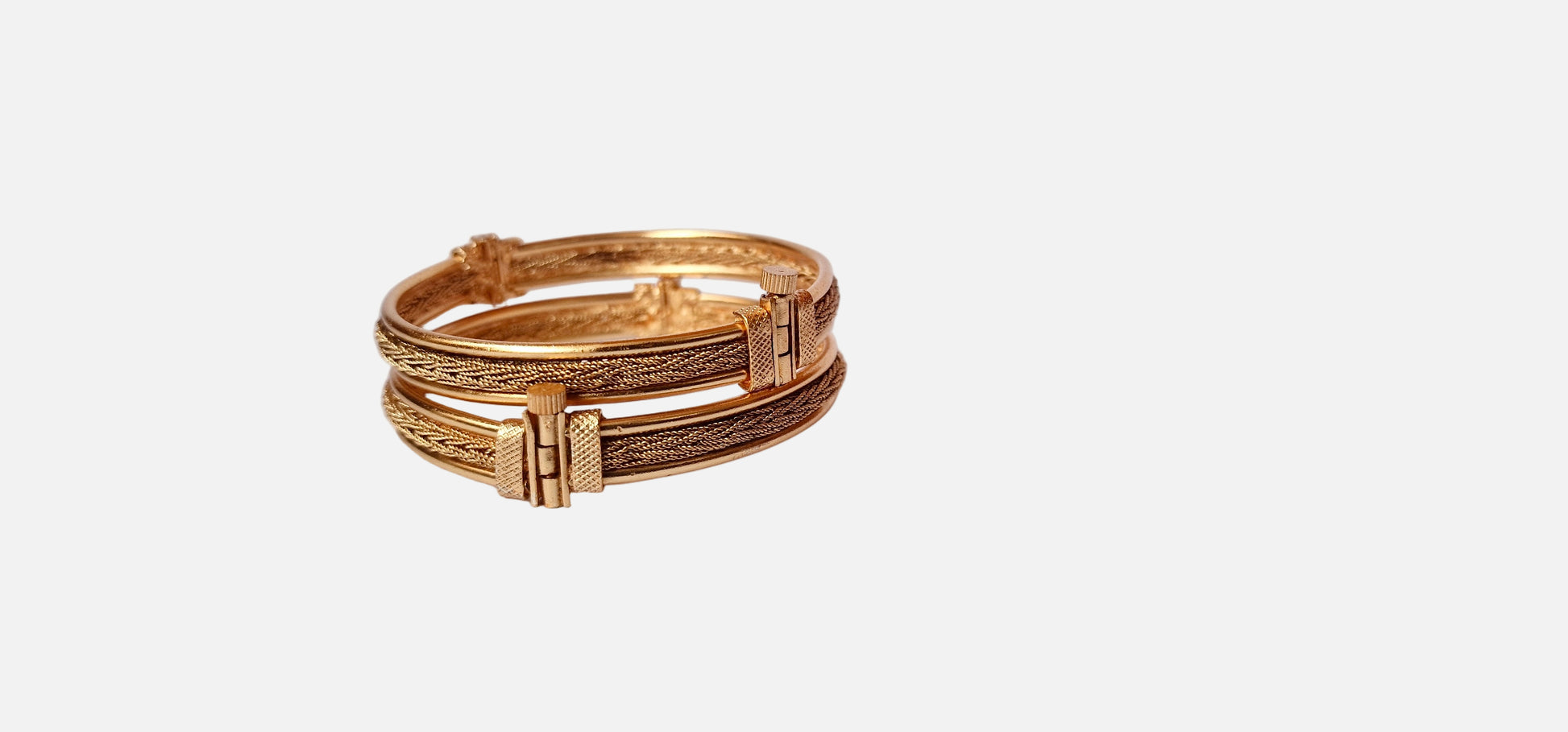 These gold bangles have a unique clasp-style design with fine textured patterns along the sides. The detailed work gives them a traditional yet stylish look, while the smooth finish makes them easy to wear all day. They are a perfect choice for pairing with both simple outfits and festive dresses.