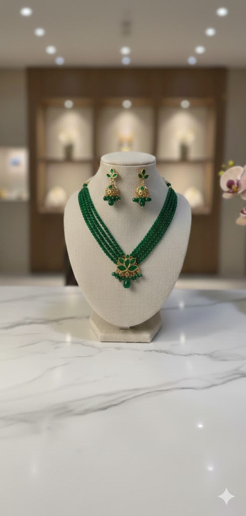 These beautiful Pearl Choker Sets come with multi-strand shiny beads that look like pearls, a lovely gold floral pendant, and matching jhumka earrings. The rich layers give a royal and festive look, perfect for special days. They are light, comfortable, and easy to wear.